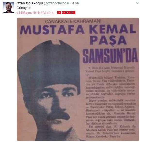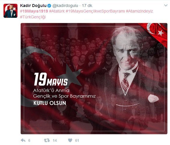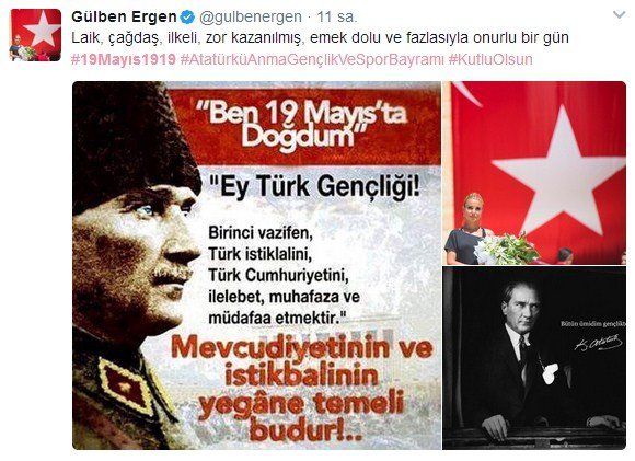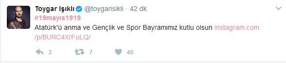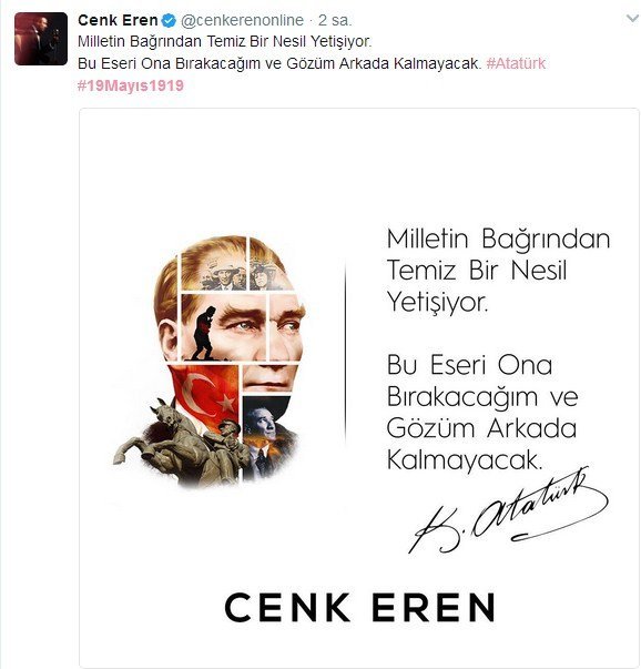 Sanat camiası, 19 Mayıs Atatürk’ü Anma, Gençlik ve Spor Bayramı için Twitter üzerinden kutlama mesajlarını paylaştı. Sanatçıların Atatürk’e olan sevgilerini paylaştığı twit’ler, büyük ilgi gördü.