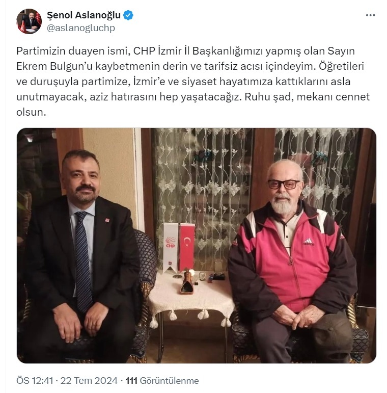 Narlıdere Belediye Başkanı Erman Uzun sosyal medya hesabından taziye mesajı yayımladı. Uzun açıklamasında, " Önceki dönemler il başkanımız, partimizin emektarı, birlikte meclis üyeliği yaptığım sevgili Hakan Bulgun’un babası, kıymetli büyüğümüz Ekrem Bulgun’u kaybetmenin derin üzüntüsünü yaşıyoruz. Merhum başkanımıza Allah’tan rahmet, Bulgun ailesine, sevenlerine ve tüm örgütümüze başsağlığı dilerim" dedi.