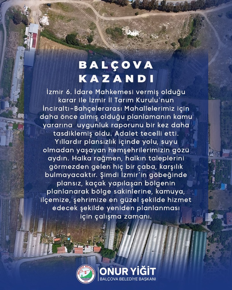 Balçova Belediye Başkanı Onur Yiğit, İzmir 6. İdare Mahkemesi’nin TMMOB Ziraat Mühendisleri Odası Genel Merkezi tarafından açılan davayı reddetmesi üzerine açıklama yaptı. Sosyal medyadan “Balçova kazandı” başlığıyla haberi duyuran Yiğit, bölgede uzun yıllardır mağduriyet yaşayan hak sahiplerine, “gözünüz aydın” mesajı verdi.
