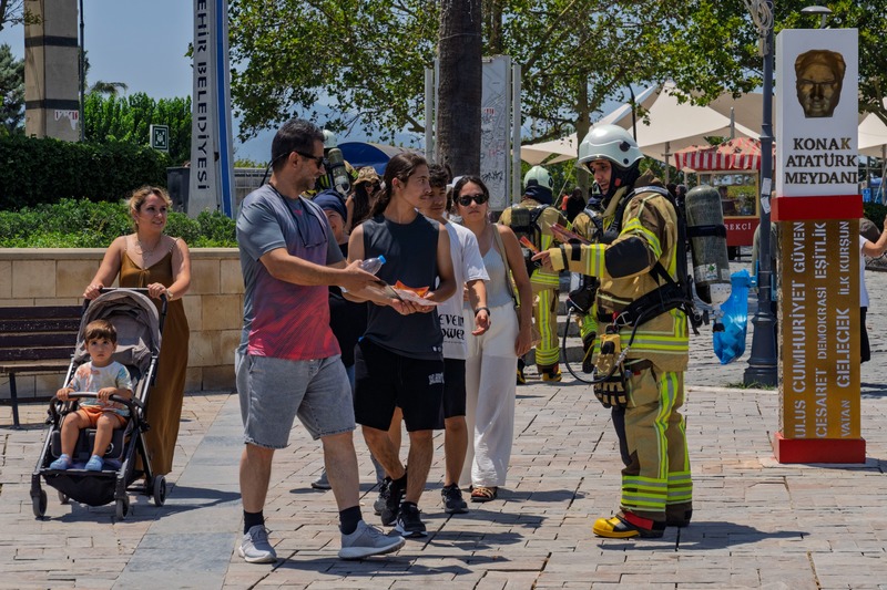 İzmir Büyükşehir Belediyesi İtfaiye Dairesi Başkanlığı, çoğu küçük ihmaller sonucu başlayan ve geride yıkıcı bir etki bırakan orman yangınlarına karşı ilginç bir farkındalık etkinliği düzenledi. Yangınlara müdahale ederken kullandıkları ısıya ve aleve karşı koruyan özel kıyafet giyen, baret ve temiz hava solunum cihazı takan itfaiye personeli, Konak Atatürk Meydanı ile Kemeraltı Çarşısı’nda broşür dağıtarak yurttaşları bu konuda dikkatli olmaya çağırdı. 40 dereceye yaklaşan sıcak havada koruyucu kıyafetle dolaşan itfaiye personelini gören vatandaşlar şaşkınlığını gizleyemedi.