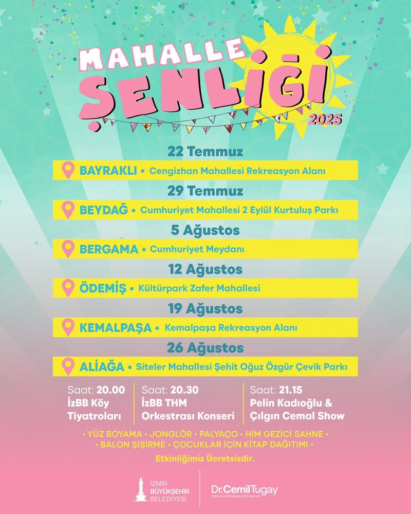 İzmirli yurttaşlar, İzmir Büyükşehir Belediyesi Kültür ve Sosyal İşler Dairesi Başkanlığı organizasyonunda düzenlenecek Mahalle Şenliği ile eğlenceli etkinliklerle buluşacak. Mahalle Şenliği, 22 Temmuz’da Bayraklı Cengizhan Mahallesi Rekreasyon Alanı, 29 Temmuz’da Beydağ Cumhuriyet Mahallesi 2 Eylül Kurtuluş Parkı, 5 Ağustos’ta Bergama Cumhuriyet Meydanı, 12 Ağustos’ta Ödemiş Kültürpark Zafer Mahallesi, 19 Ağustos’ta Kemalpaşa Rekreasyon Alanı ve 26 Ağustos’ta Aliağa Siteler Mahallesi Şehit Oğuz Özgür Çevik Parkı’nda gerçekleştirilecek.