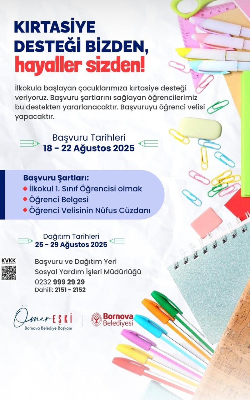 Kırtasiye desteği için 18 Ağustos’ta başlayan başvurular 22 Ağustos’ta sona erecek. Dağıtımlar ise 25 – 29 Ağustos 2025 tarihleri arasında gerçekleştirilecek. Başvuru ve dağıtım yeri olarak Bornova Belediyesi Sosyal Yardım İşleri Müdürlüğü belirlendi.