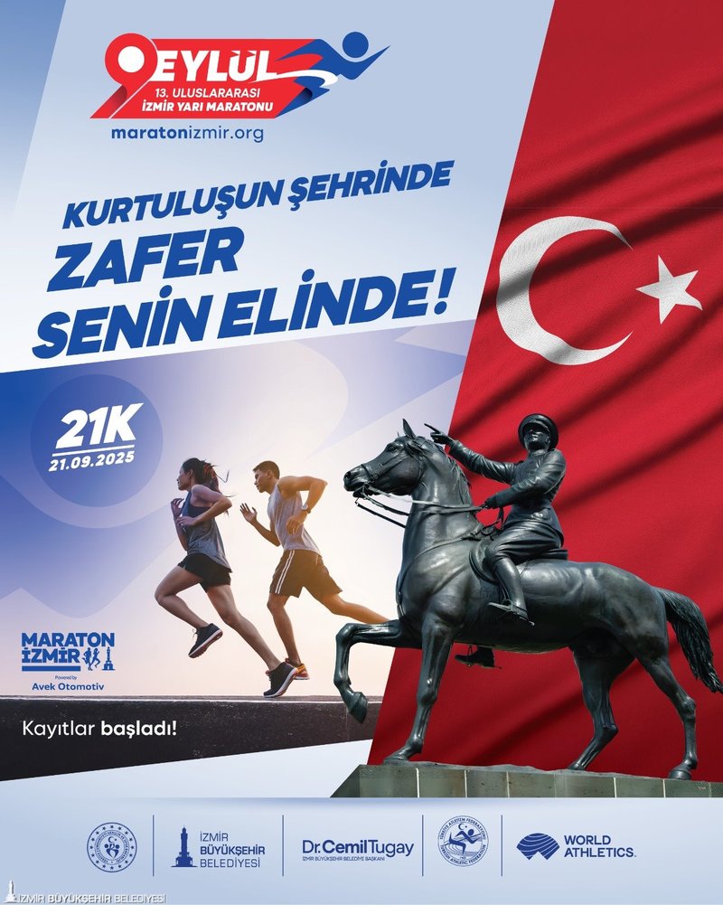 İzmir Büyükşehir Belediyesi’nin düzenlediği 13’üncü Uluslararası Dokuz Eylül İzmir Yarı Maratonu için kayıtlar başladı. 21 Eylül’de kurtuluşun ve kuruluşun şehrinde zafer yaşamak isteyen sporcular https://www.maratonizmir.org/ adresinden kayıtlarını yapabilecek.