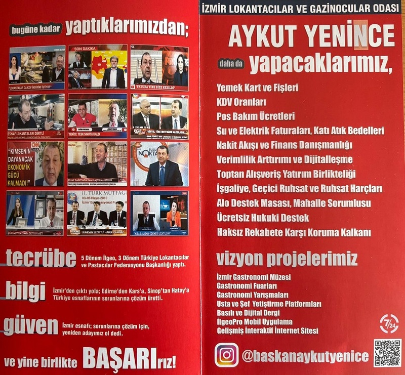 İzmir Lokantacılar ve Gazinocular Odası Başkan Adayı Aykut Yenice odanın deneyimli insanlara ihtiyacı olduğunu belirterek: “Sektörde sorun çok. Yemek kartı ve KDV oranları ciddi bir sorun oluşturuyor. Bu konuyla ilgili olarak Ankara’da çalışmalar yapılması gerekiyor.  Pos bakım ücretleri sorunu var. Elektronik ortamda karşılıklı para alışverişi yapıyoruz. Ama her ay pos bakım ücreti altında ciddi paylar alınıyor. Su ve elektrik faturaları sektörün belini büküyor. Her ay faturalar giderek artıyor.  İzmir’in en büyük işletmeleri bizim odamızdan. Yüksek kiralar ödüyoruz.  Tüm bu sorunları halletmek için bilgi ve tecrübemden yararlanacağım. Bu deneyimimi aktarmak istiyorum. Odamızın bilgi ve deneyime sahip insanlara ihtiyacı var” dedi.