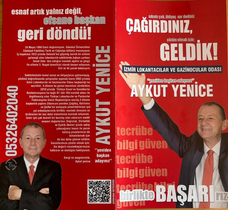 İzmir Lokantacılar ve Gazinocular Odası Başkan Adayı Aykut Yenice sektörün sorunlarından bahsederek: “Ben 1912’de Selanik’ten İzmir’e göç etmiş bir ailenin lokantacılık sektöründe 3. Kuşak temsilcisiyim.  2002 yılında İzmir Lokantacılar Odası başkanlığına seçildim.  20 yıl bu görevi sürdürdüm.  Türkiye genelinde odaların başkanlığını yaptım.  Biz kendimizi yaşadığımız kente katkı koyan insanlar olarak görüyoruz.  Sektör her geçen gün daha sıkıntılı hale geliyor. Pandemi bizi etkiledi. İstanbul’da yaşanan zehirlenme olayı da etkiledi.  Çok ağır eleştirilerle karşı karşıya kaldık. Ama olayın aslı farklı çıktı. Sektörün göz önünde olması bizi etkiliyor. Kayıt dışı ve haksız rekabetle uğraşıyoruz. Pos cihazlarından alınan paylarda sorunların başında geliyor. Şuandaki oda temsilcilerinin bu sorunları çözebileceğine inanmadığımız için tekrar aday oldum” dedi.