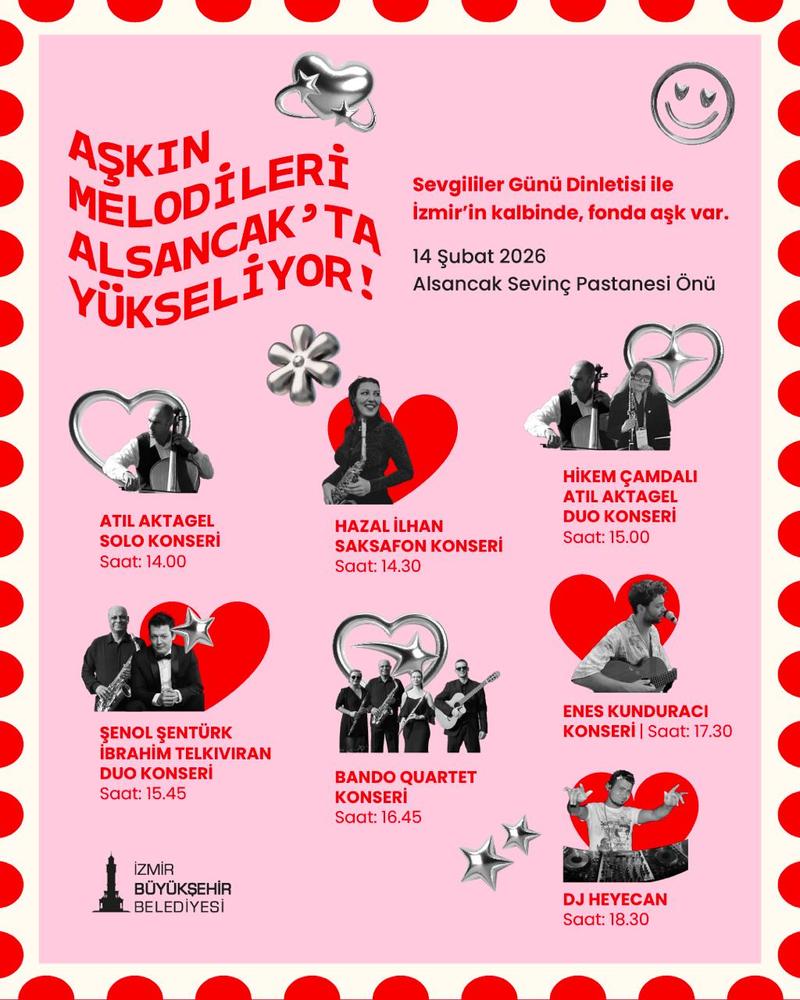 14 Şubat Sevgililer Günü, İzmir Büyükşehir Belediyesi tarafından Alsancak Kıbrıs Şehitleri Caddesi girişinde önünde müzikle kutlanacak. Saat 14.00’te başlayacak programda Atıl Aktagel, Hazal İlhan, Hikem Çamdalı-Atıl Aktagel, Şenol Şentürk-İbrahim Telkıvıran, Bando Quartet, Enes Kunduracı konserleri yapılacak. Saat 18.30’da ise DJ Heyecan sahne alacak. Etkinlik ücretsiz olacak.