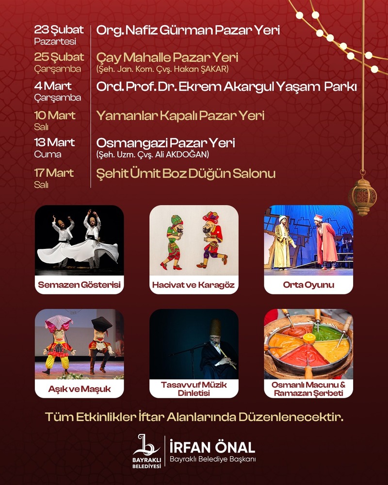 İftar programlarının ardından gerçekleştirilecek etkinliklerde, geleneksel Ramazan kültürünü yaşatan gösteriler Bayraklılılarla buluşacak. Hacivat ve Karagöz gösterileri, orta oyunu ve çeşitli sahne performansları, ailelere keyifli anlar yaşatırken; paylaşma ve birliktelik geleneği mahalle kültüründe yeniden canlanacak.