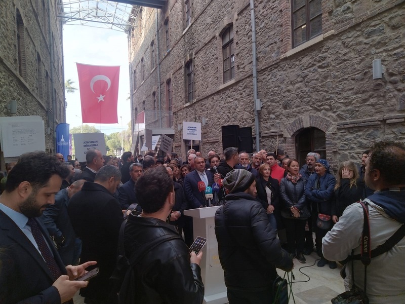 Başkan Cemil Tugay konuşmasının başında yeni gelişmelerin olduğunu belirterek: "Bizim için çok üzücü bir süreç olduğunu ifade etmek isterim. Bizler böyle bir durumun içine düşmekten memnun değiliz. Ne yazık ki ülkemizin zaman zaman yaşadığı gerçekler bunlar. Ne kadar iyi niyetli olsak da bize bu tür şeyler bazen yaşatılıyor. Her durumda görevimizin bilincindeyiz, sorumluluğumuzun bilincindeyiz. O sorumluluğun bize yüklediği görevi yerine getirmek için üzerimize ne düşüyorsa yapma kararlılığındayız. Ben sabah buraya gelirken, burada beklemeyi ve üzerime düşeni yapmayı kararlaştırmıştım. Bir taraftan mahkeme olarak gelişmelerin olduğunu söylemiştim. Hukukçu arkadaşlarımızın yaptığı pek çok başvuru var. Bunlar yürütmenin durdurulması için ya da zorla tahliye edilmesini engellemek için yapılan girişimler. Bunlardan birisinde idari mahkeme 15 günlük yürütmeyi durdurtma kararı verdi. Bunu duyduğumuz zaman hepimiz bir nefes aldık. Bu haksız uygulamanın 15 günlüğüne de olsa durduğunu öğrendiğimiz için. Ancak hala çok haksız ve yanlış bir şekilde hem meslek fabrikamız hem de diğer binalarımız ne yazık ki hiçbir şekilde bize bilgi verilmeden Vakıflar Genel Müdürlüğü’nün mülkiyetine geçirilmiş durumda. CHP, Anayasa Mahkemesi’ne iptali için başvurdu. Orada da süreç devam ediyor. Sadece İzmir’in değil İstanbul başta olmak üzere pek çok başka şehrin de yaşadığı bir sorun bu. Sadece bizim yaşadığımız bir durum değil bu. Türkiye’nin her tarafında bu yanlış kararlar uygulanmaya çalışıyor” dedi.