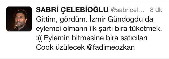 Sabri Çelebioğlu zaten hükümetin borazanı olduğu yıllardır tescilli olan ve cemaate bağlı yayınların bile aboneliğini çektiği Anadolu Ajansı’nda iktidarın mutlu olabileceği bir tweet atmış. Demiş ki, “Gittim gördüm. Gündoğdu’da eylemci olmanın ilk şartı bira tüketmek. Eylemin bitmesine bira satıcıları çok üzülecek.”