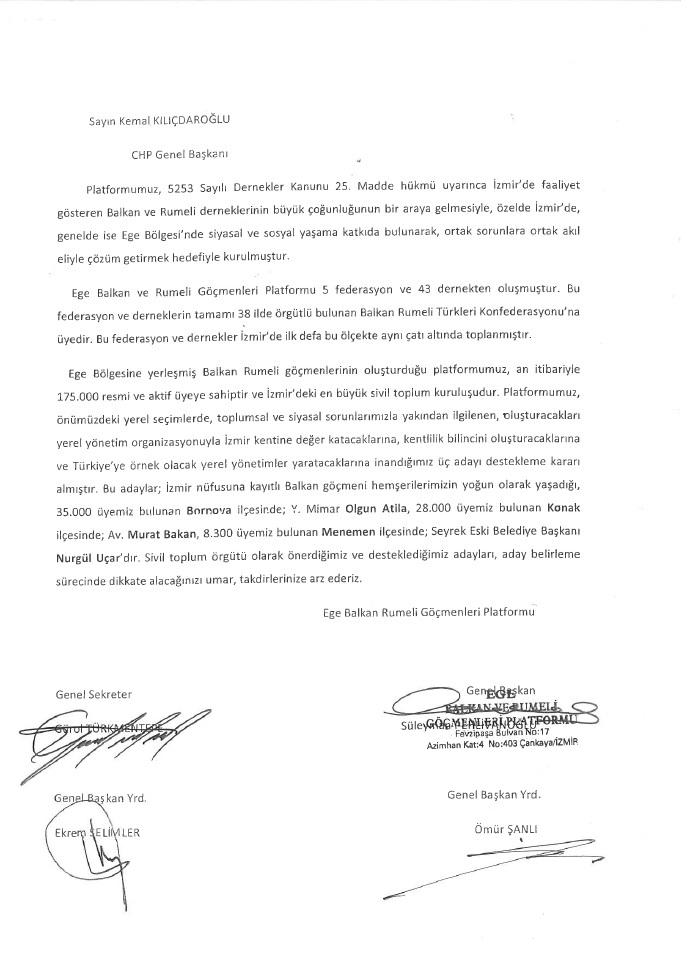 Adı Büyük İzmir Balkan Platformu olan ve henüz birkaç gün önce kurulan bir platform, CHP Genel Başkanı Kemal Kılıçdaroğlu’na hitaben bir “Torpil Mektubu” yazmış. Özetle, platform yöneticileri üç büyük ilçenin Belediye Başkanlık makamını, şimdiden bir güzel dizayn etme çabasına girişmişler..