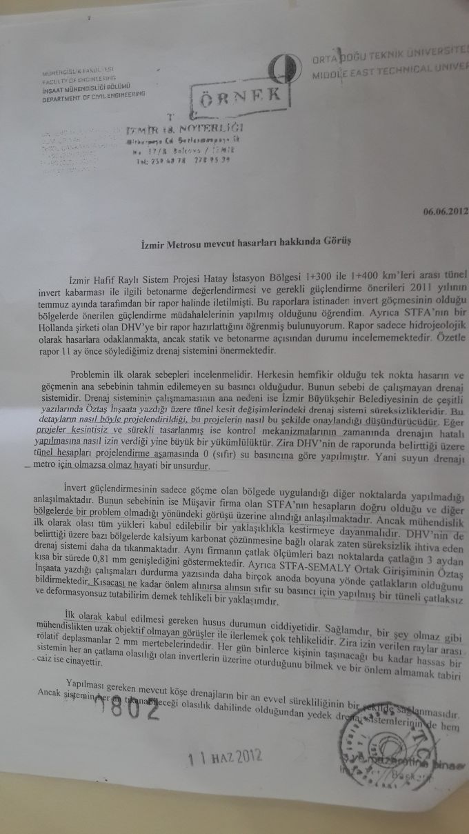 Dünkü manşetimizde de yayınladığımız üzere ODTÜ’nün bu güzergahtaki tünellerde bazı yerlerin sağlam olmadığı çatlaklar olduğu ayrıca drenaj sisteminin hatalı yapıldığı ve tünel hesapları projelendirme aşamasında sıfır su basıncına göre yapıldığı, suyun drenajının Metro için hayati bir unsur içerdiği ifade ediliyor. Raporda Metro’nun bu haliyle hayati risk içerdiğine dair ciddi uyarılar var.