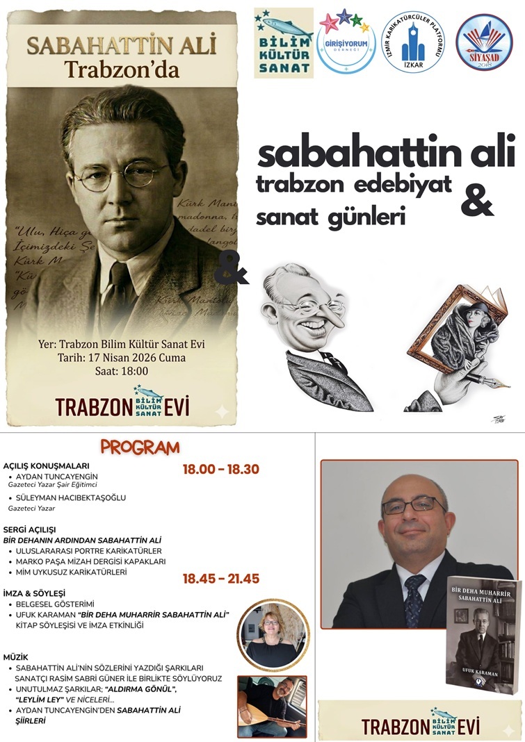 Trabzon Bilim Kültür Sanat Evi’nde 17 Nisan 2026 Cuma günü saat 18.00’de gerçekleştirilecek etkinlikte, Araştırmacı Yazar Ufuk Karaman "Bir Deha Muharrir Sabahattin Ali" kitabı hakkında konuşacak ve kitaplarını imzalayacak.